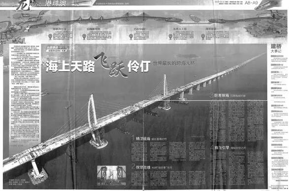 如何在版面上呈现这一世纪工程?极其考验报纸的采编团队。作品以跨版对角线的方式,以港珠澳大桥的航拍照片为底,将大桥的气势与细节展现在读者面前。再配上提前数周就准备好的大桥全景示意图,全方位立体地展示港珠澳的组成、工程进展、挑战难度及所代表的世界级高精尖的技术等。让读者既能享受视觉上的冲击美感,又对大桥的壮美有了全局的窥探,同时在对大桥