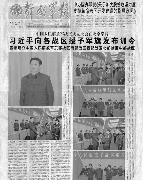 【简介】成立战区是此轮军改的重要标志性事件,举世瞩目。该版面充分体现了解放军报作为军委机关报的职能担当,以强势的版面语言,图文并茂记录了这一重大历史时刻。版面以可视化方式呈现,特色鲜明,大气舒朗,保证了重要信息的传递和版面视觉冲击力,突显了大报风范,整体效果好。