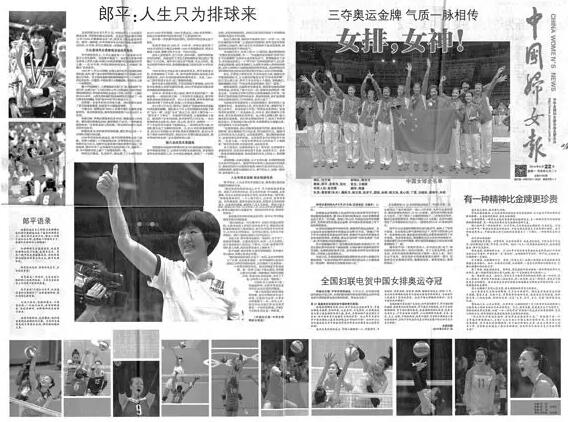 【简介】北京时间2016年8月21日,在里约奥运会女排决赛中,中国队战胜塞尔维亚队获得金牌。本报采用一四通版的形式全方位报道女排夺冠的消息。稿件采用多种体裁,全面反映女排夺冠的荡气回肠、举国欢庆的场面。大合影生动展现了女排夺冠的激动时刻,同时截取赛场精彩图片,从细节反映女排队员的拼搏精神,并结合主教练郎平的心路历程展现女排精神的传承和延续。编辑通过融媒体手段将女排夺冠的消息及女排的精神内涵予以呈现,评论员文章和精彩的图片让女排的精神气质跃然纸面。该版在生动再现女排辉煌历程的同时,也总结提升了新时期的女排精神,在广大读者尤其是女性读者中引起了强烈反响,经中国妇女报官微转发后,产生了广泛的社会影响。
