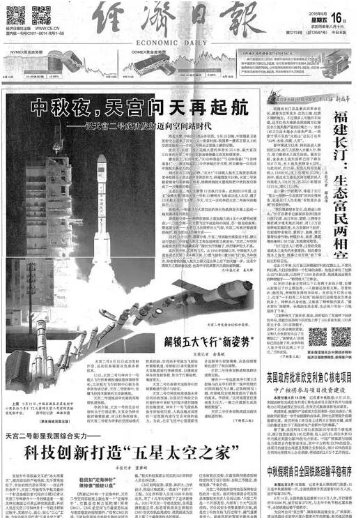 该版面围绕天宫二号成功发射这一主题,利用消息、通讯、特写、照片、图表等元素的合理搭配,营造出视觉冲击力强、蓬勃大气的氛围,突出了我国航空航天事业取得的重大,鼓舞人心、提振士气。整个版面设计精心,文章安排详略得当,信息量大,可读性强。