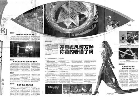 【简介】奥运会开幕式恢弘上演,全球共同聚焦这一体育盛事。当天,编辑将新华社数十篇稿件拆分、整合、重组,通过解读、聚焦、花絮、数读、评论、看点等栏目,详解了开幕式的诸多细节,让读者读懂了画面背后的文化和新闻,可读性强。该版面版式新颖、大气,图片精美,与文字相得益彰,抓人眼球。