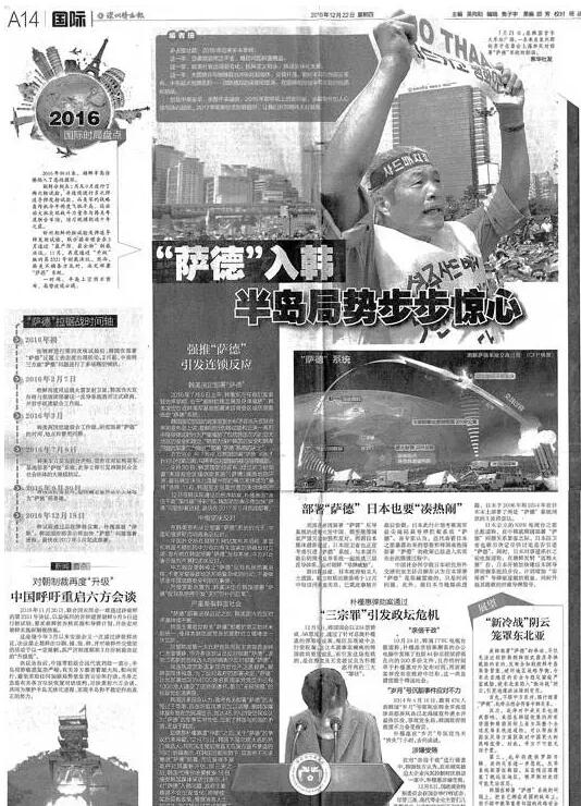 【简介】深圳特区报2016年末推出“国际时局盘点”三个版,分别从“‘萨德’入韩,半岛局势步步惊心”“两国公投,民粹主义改变欧洲”以及“地盘萎缩,‘伊斯兰国’恐袭变招”三个方面勾勒当年的国际重大事件及其走向。“‘萨德’入韩,半岛局势步步惊心”是其中的首个盘点版。