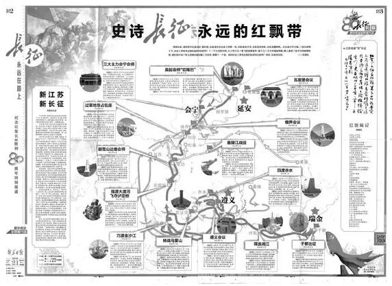 【简介】“史诗长征,永远的红飘带”跨版集文字、路线图、图片、视频二微码为一体。其中的长征线路图精准、简洁的概括了红军途径的地点,在十四个关键节点的位置,文字与其标志建筑物排列组合,使整个版面可读、可视,气势磅礴,且疏密有致、层次分明,可谓创新力度大、亮点多。不仅被省委宣传部领导点赞,也得到朋友圈的热情转发,有些读者甚至来电求报纸收藏,有的说正好拿来当范本给孩子讲述长征。