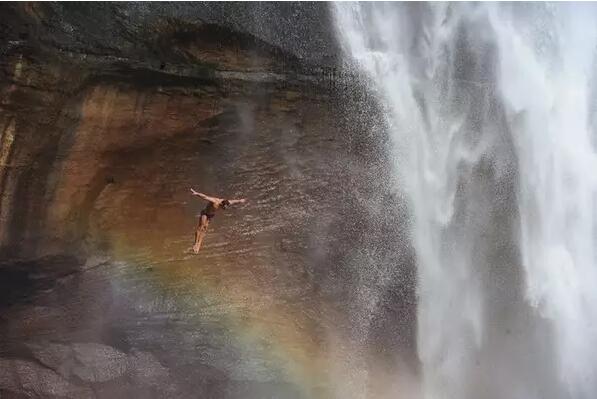 【作品简介】瀑布跳水是首次在国内举办的极限跳水赛事,运动员从27米高处起跳完成比赛规定动作,具有观赏性和一定的危险性,比赛当日为多云天气,记者在完成跳台俯拍和瀑布底仰拍后,步行到瀑布对面准备进行远拍,这时,太阳从云层中露出,在光照下,瀑布形成一道彩虹,记者抓住运动员在彩虹顶上进行的飞跃动作,完成了这幅作品的拍摄。