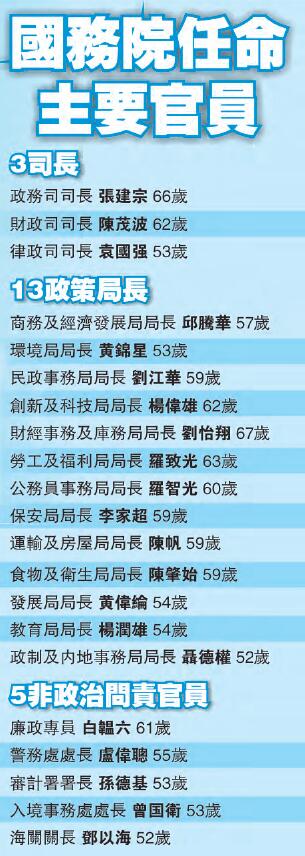 任命張建宗為政務司司長;任命陳茂波為財政司司長;任命袁國強為律政司司長;任命羅智光為公務員事務局局長;任命劉江華為民政事務局局長;任命李家超為保安局局長;任命聶德權為政制及內地事務局局長;任命陳肇始(女)為食物及衛生局局長;任命劉怡翔為財經事務及庫務局局長;任命楊潤雄為教育局局長;任命黃偉綸為發展局局長;任命邱騰華為商務及經濟發展局局長;任命陳帆為運輸及房屋局局長;任命羅致光為勞工及福利局局長;任命黃錦星為環境局局長;任命楊偉雄為創新及科技局局長;任命曾國衛為入境事務處處長;任命鄧以海為海關關長;任命白韞六為廉政專員;任命孫德基為審計署署長;任命盧偉聰為警務處處長。