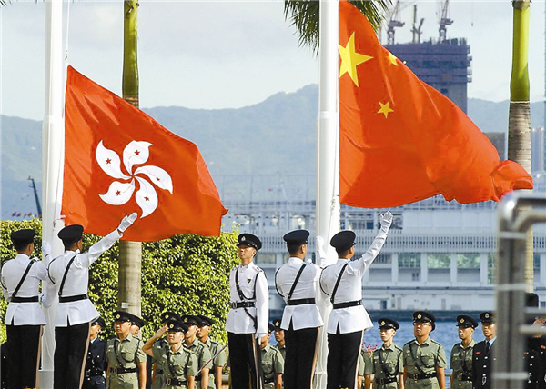 五星红旗和紫荆花旗冉冉升起。