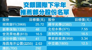 就各行業的投資策略,交銀國際將保險業、消費行業、互聯網及科技行業、以及物流及基建行業評為「領先」級別;其中,港股推薦名單包括招商銀行(3968)、新華保險(1336)、世茂房地產(813)、金沙中國(1928)、海昌海洋公園(2255)、舜宇光學(2382)、騰訊(700)、瑞聲科技(2018)、北控水務(371)、吉利汽車(175)、華能新能源(958)及中交建(1800)等。