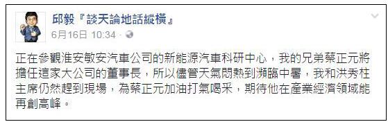 前國民黨“立委”邱毅16日曾在臉書指出,他和國民黨黨主席洪秀柱頂著悶熱的天氣,到蔡正元即將擔任董事長的敏安汽車公司參觀、為他加油打氣。