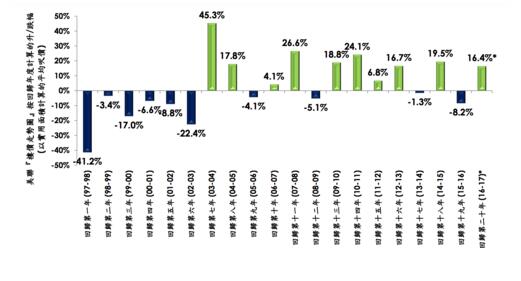 過去20年香港經濟遭遇過不少沖擊,從97年金融風暴,到2003年非典肆虐,再到2008年的金融海嘯,都讓樓價遇冷。據智通財經了解,這二十年來樓價經曆了十次的大起大落。