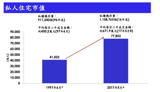 劉嘉輝表示,若從香港私人住宅總存量及平均每宗二手成交金額來計算市值,1996年私人住宅總巿值約為4.1萬億元,目前的巿值約7.8萬億元,升幅約90%,在20年間翻一番。