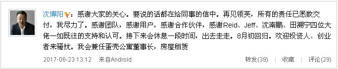 同时,沈博阳在今天中午发布微博及告别信,对离任一事作出回应。在微博中,他表示将会在8月初回归,兼任蛋壳公寓董事长,并称房屋租赁市场会诞生下一只独角兽。