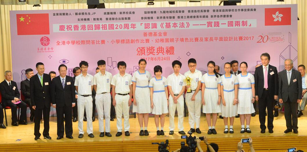 《基本法》知識系列比賽從今年3月23日正式啟動以來,全港共有441間中學、小學、幼稚園、超過3萬名學生和家長參加。其中全港中學校際問答比賽的決賽,昨日由6間中學進行比賽,最終由中華傳道會安柱中學取得380分壓倒第2名英華書院奪冠,實現問答比賽3連霸,第3名由聖公會鄧肇堅中學獲得。