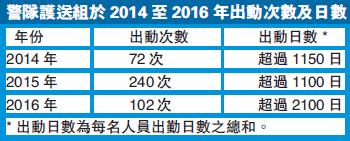 警隊護送組高級督察莊金印表示,警隊護送組的主要職能是要員護送,包括護送各國訪港的元首政要等,以及協助要員保護組提供有效的保安,確保要員的車隊能夠安全、準時到達目的地,并以適當的高姿態護送要員,配合其身份地位。莊金印指,護送組近年出勤次數有上升趨勢,在2016年一共出勤102次,隊員總出勤日數超過2100次,較2015年上升近1倍,當中出勤任務除了要員護送,亦包括護送貴重物品、現鈔、彈藥,以及最高榮譽喪禮的特別任務。