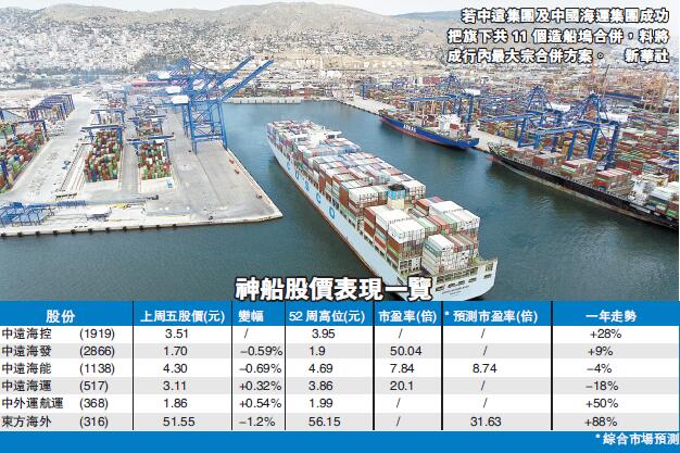 市場憧憬「強強聯手」,翻炒央企重組概念,長線看好內地四大央企航運股,有機會合併組成「神船」。除中遠中海運或將合併的利好消息傳出外,市場本月亦傳出前特首董建華家族旗下企業東方海外(316)或會賣盤,中遠海運擬斥約300多億港元,收購東方海外旗下子公司東方海外貨櫃航運,交易最快下月公布,種種迹象顯示「神船」出台的日子不遠。