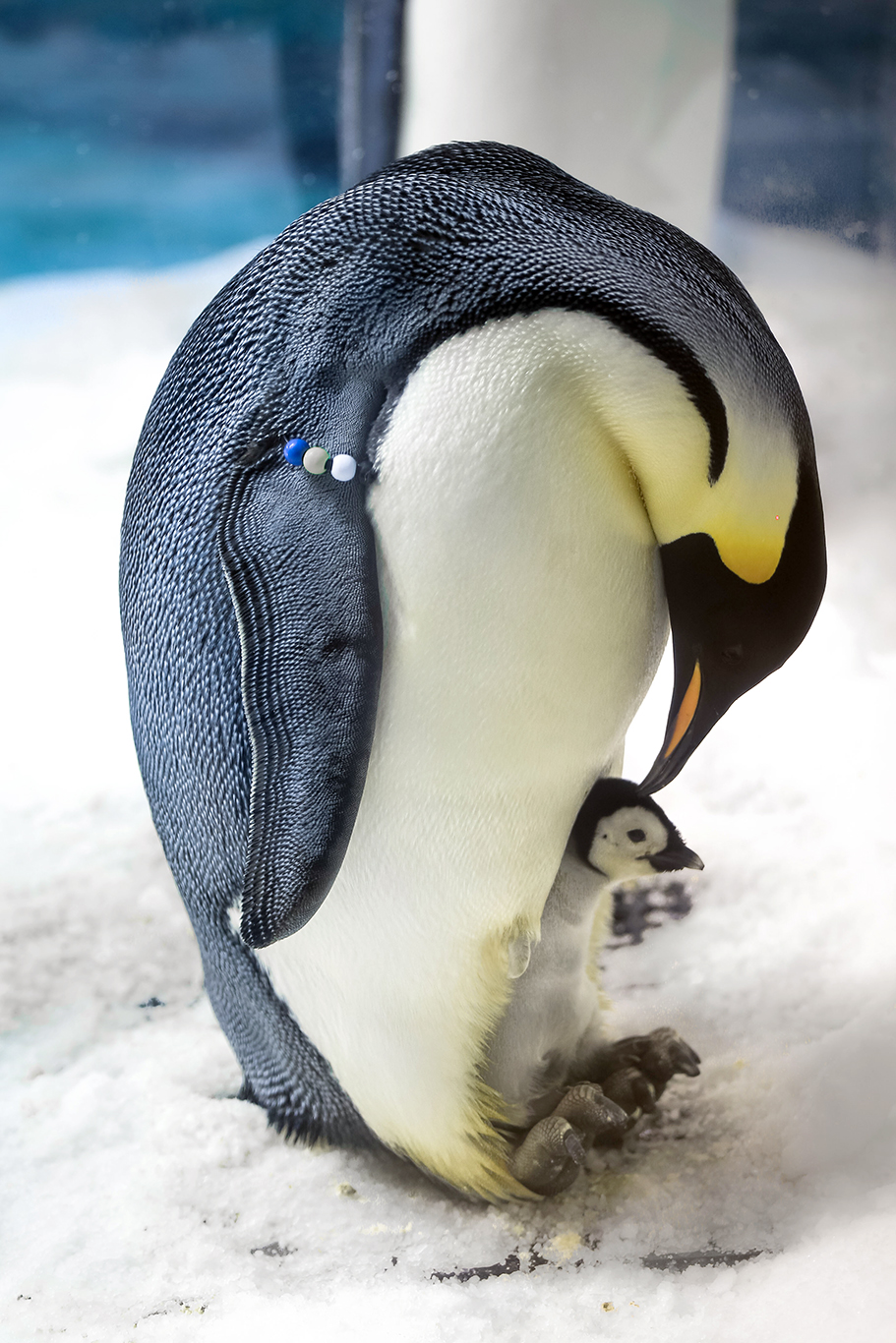 記者看到,未滿月的小帝企鵝時不時地從爸爸的育兒袋裏探出小腦袋,好奇的小眼睛、銀灰色的毛茸茸外表,萌化全場。在大家的見證下,海洋王國助理總經理李湛偉先生現場公布了兩位新生極地小明星的名字:“六六”和“恩恩”。