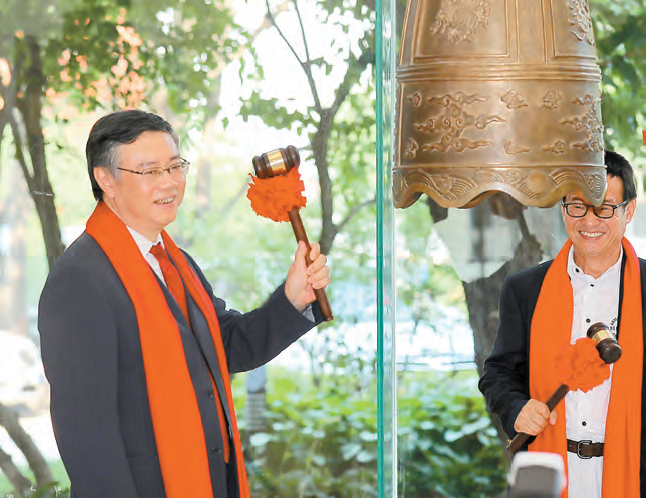 6月26日下午,深圳報業集團黨組書記、社長陳寅(左一)敲響了深新傳媒牌「新三板」的鐘聲