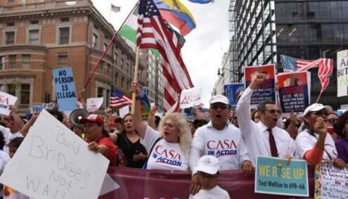 資料圖:5月1日,在美國首都華盛頓,示威人群在杜邦環島舉行集會后,一直行進到白宮北面的拉法耶特廣場,抗議特朗普的入境政策等。