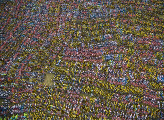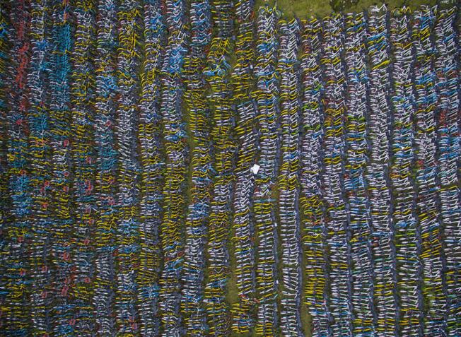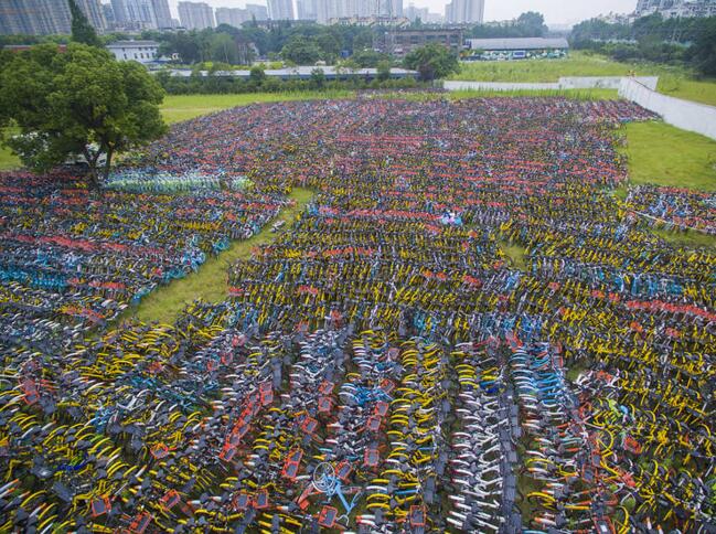 2017年6月26日,杭州,城南的一處空地上,上萬輛共享單車被棄之荒野。綿延上千平米的露天荒地上,各品牌的各色單車密密麻麻。