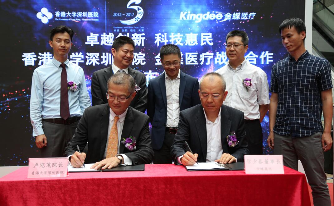 簽約儀式在香港大學深圳醫院舉行,深圳市醫管中心洪智明部長、港大深圳醫院院長盧寵茂教授、金蝶創始人、金蝶集團董事會主席、金蝶醫療董事長徐少春先生和金蝶醫療總經理尹治國先生等領導出席了簽約儀式。