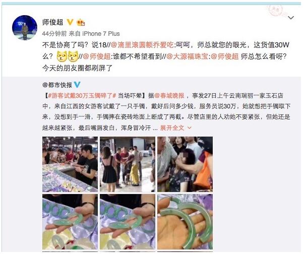 對于目前雙方協商的價格,該知情人透露,“暈倒的家屬愿意賠償7萬,但因為商家本錢都沒有賺回來,所以還在溝通。”而在微博上,也有認證信息為“知名文玩收藏博主”的微博網友“師俊超”在微博上透露,“不是協商了嗎?說18。”