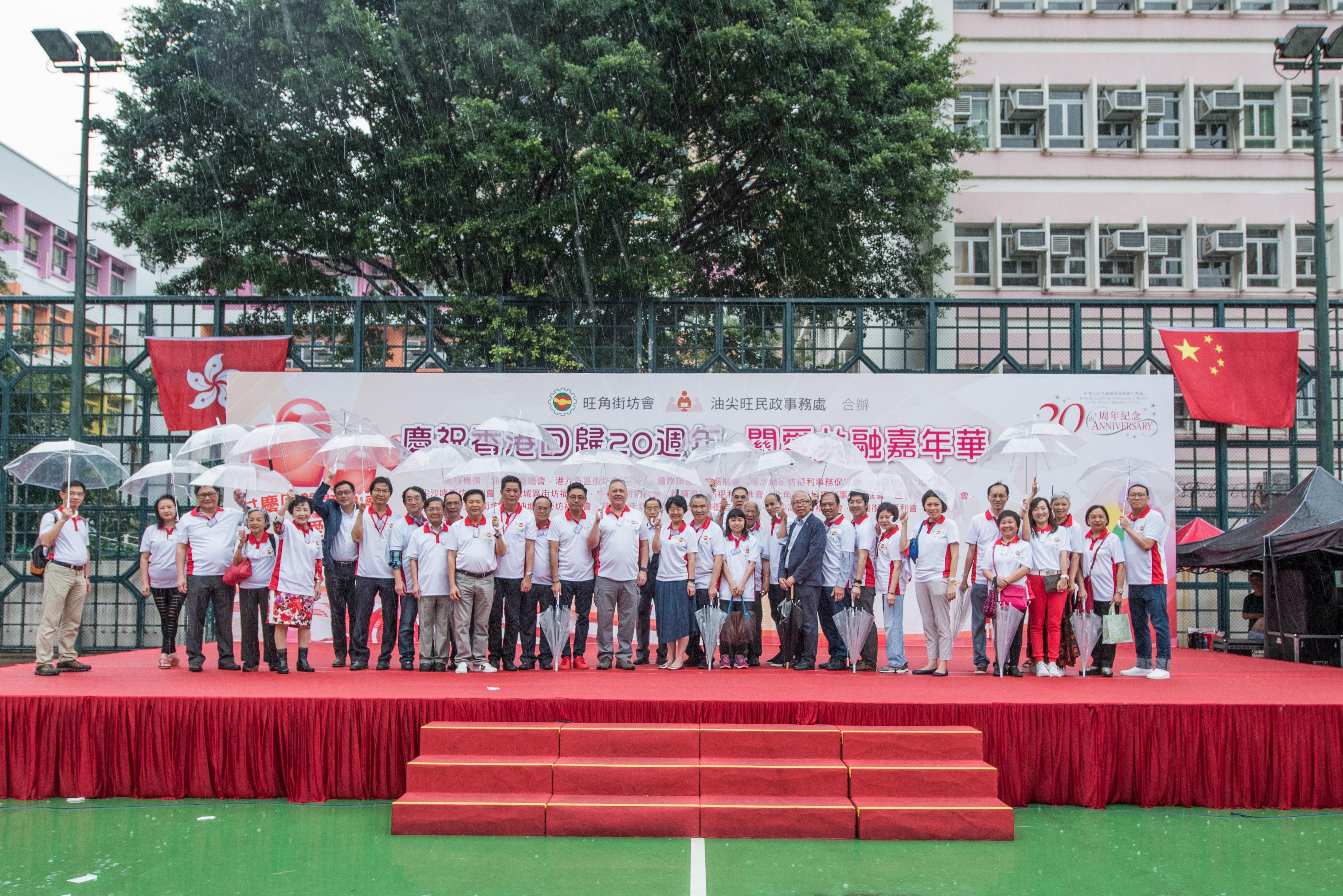 【香港商報訊】旺角街坊會與油尖旺民政事務處聯合舉行的「慶祝香港回歸二十周年關愛共融嘉年華」,日前於大角咀晏架街游樂場舉行,中聯辦九龍工作部副部長王小靈、油尖旺區議會主席葉傲冬、社會福利署九龍城及油尖旺區福利專員關淑儀、旺角警區指揮官甘榮耀總警司、油尖旺區議會副主席黃舒明、康樂及文化事務署油尖旺區康樂事務經理許家文等蒞臨主禮,油尖旺民政事務專員蔡亮,該會理事會主席梁華勝、監事會主席羅惠珍,大會統籌委員會主席葉德榮,大會主席王子成,大會會長吳錦祥,大會副主席羅犖銘、林福源、黃保勤聯同各理監事一同主持開幕儀式。活動當日中山巿委統戰部副部長鄭向榮、廣州巿海珠區政協副主席邱建華及各區街坊會首長、地區團體領袖、市民街坊如期而至,冒雨參與嘉年華活動,反響熱烈。