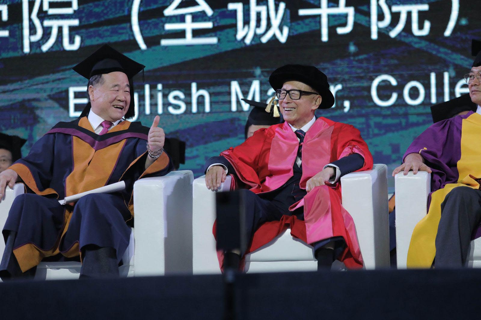 李嘉誠此行親自向出席汕大畢業禮及校董會會議的基金會董事李澤楷,介紹校園內各重要建築、地標及其歷史,以及汕大的發展計劃。諾貝爾文學獎得主莫言教授親臨汕大,致辭時勉勵同學「要有鴻鵠之志,又要實事求是」。他引用拿破崙「不想當將軍的士兵,不是好士兵;而當不好士兵,永遠當不好將軍」一話,寄語畢業同學「年輕人就是要敢於挑戰。像海燕一樣,渴望着暴風雨的洗禮,無論遇到再大的困難,也不要懼怕。」莫言:年輕人就要敢於挑戰莫言又勉勵同學在「投身到第四次工業革命的浪潮中,奮勇搏擊,爭取在不久的將來成為不同崗位上的狀元,成為不同角度的模範。」同學們要「成為自己認為沒什麼了不起,別人認為你確實了不起的人。」