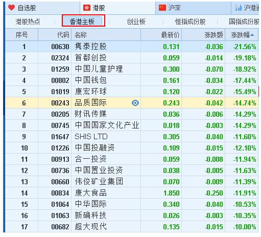 其中主板中,跌幅最大的為雋泰控股(00630),跌21.56%,報價0.131港元。創業板中跌幅最大的為匯隆控股(08021)跌15.63%,報價0.027港元。