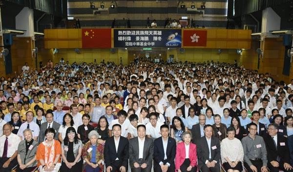 為慶祝香港特別行政區成立20周年,香港中華基金中學邀請了楊利偉、景海鵬及陳冬到校內分享中國航天科技的發展與成就,來自26間中小學的數百名學生參與。楊利偉形容,當身體感受到失去重力時的確很興奮,由太空看到整個地球非常漂亮,而過往只能從傳媒知道太空的感覺。楊又說,中國載人航天工程從1992年立項至今,歷經25年,暫時有11名航天員進入太空。