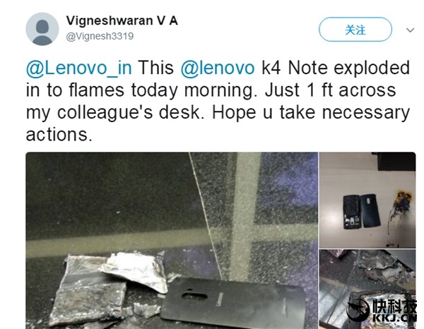 就在我們以為手機爆炸這事兒即將銷聲匿跡的時候,上周五,印度網友@Vignesh3319在推特爆料,自己的一台聯想手機在辦公桌前爆炸。