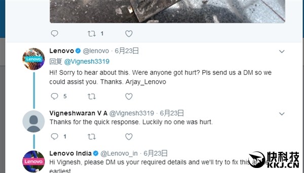 不過,隨後聯想官方火速回應,慰問是否有傷情,同時印度官推也聯系網友尋求更進一步的信息。