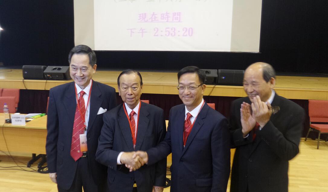 2015年,劉業強(右二)接父親劉皇發(左二)棒就任鄉議局主席,左右二人為副主席林偉強及張學明。