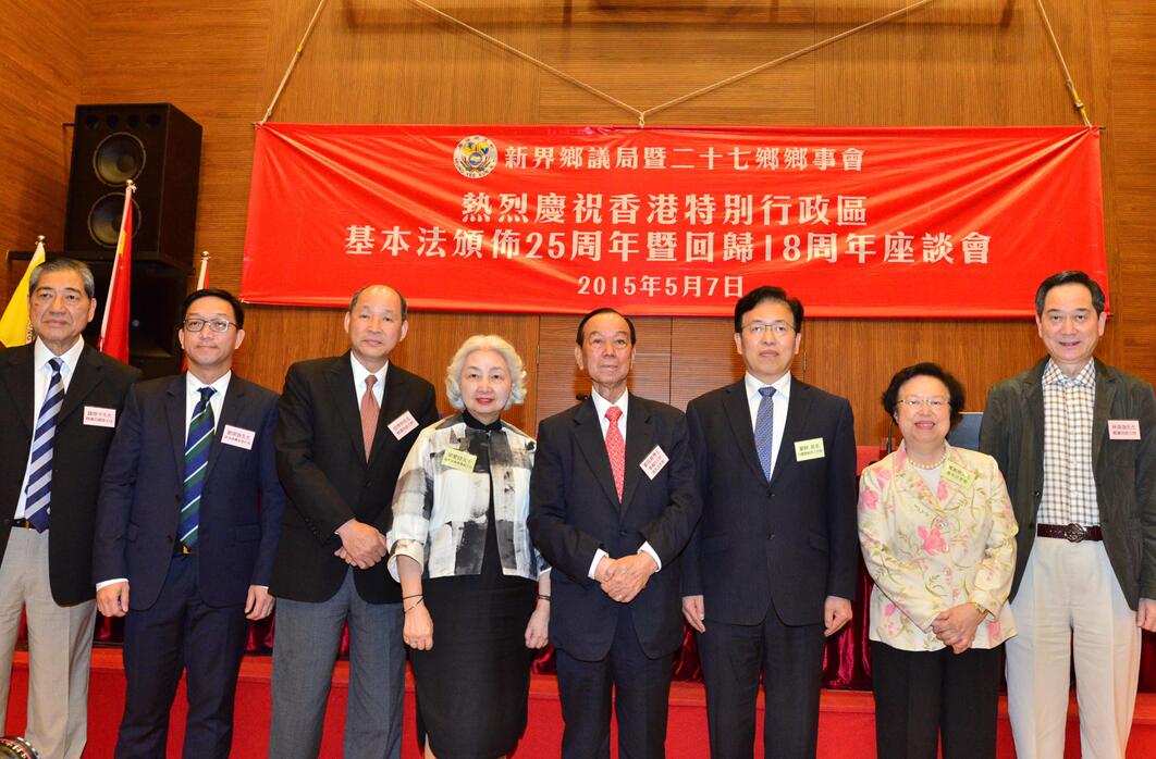 2015年5月,鄉議局舉辦《基本法》座談會,主席劉皇發(右四)、基本法委員會副主任梁愛詩(左四)、草委委員譚惠珠(右二) 、中聯辦新界工作部部長劉林(右三)會上合照,左二為劉業強。