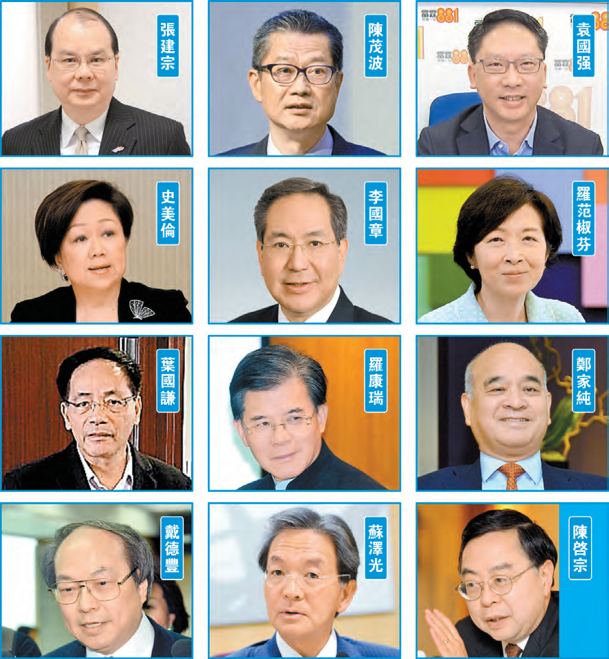 張建宗、陳茂波、袁國強、史美倫、李國章、羅范椒芬、葉國謙、羅康瑞、鄭家純、戴德豐、蘇澤光、陳啟宗