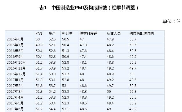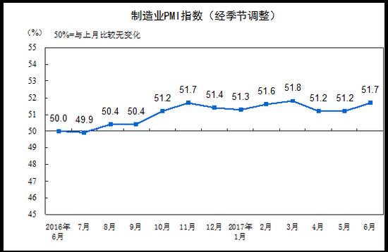 2017年6月份,中國制造業采購經理指數(PMI)為51.7%,比上月上升0.5個百分點,制造業擴張步伐有所加快。