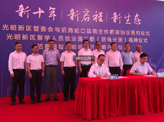 签约仪式后,举行了“光明新区留创园”揭牌仪式和招商智慧城启动区三期开工仪式。光明新区留创园一期于2013年11月在招商局智慧城开园,共引进34个创业项目,目前已有4个项目孵化成功,10个项目进入规模化生产阶段。园内引进国家“千人计划”人才7名,培育出首个孔雀团队,诞生了14名“孔雀人才”,为新区聚集了大批高端人才。招商局智慧城启动区三期的开工,意味着招商蛇口拉开了新十年建设光明的序幕。