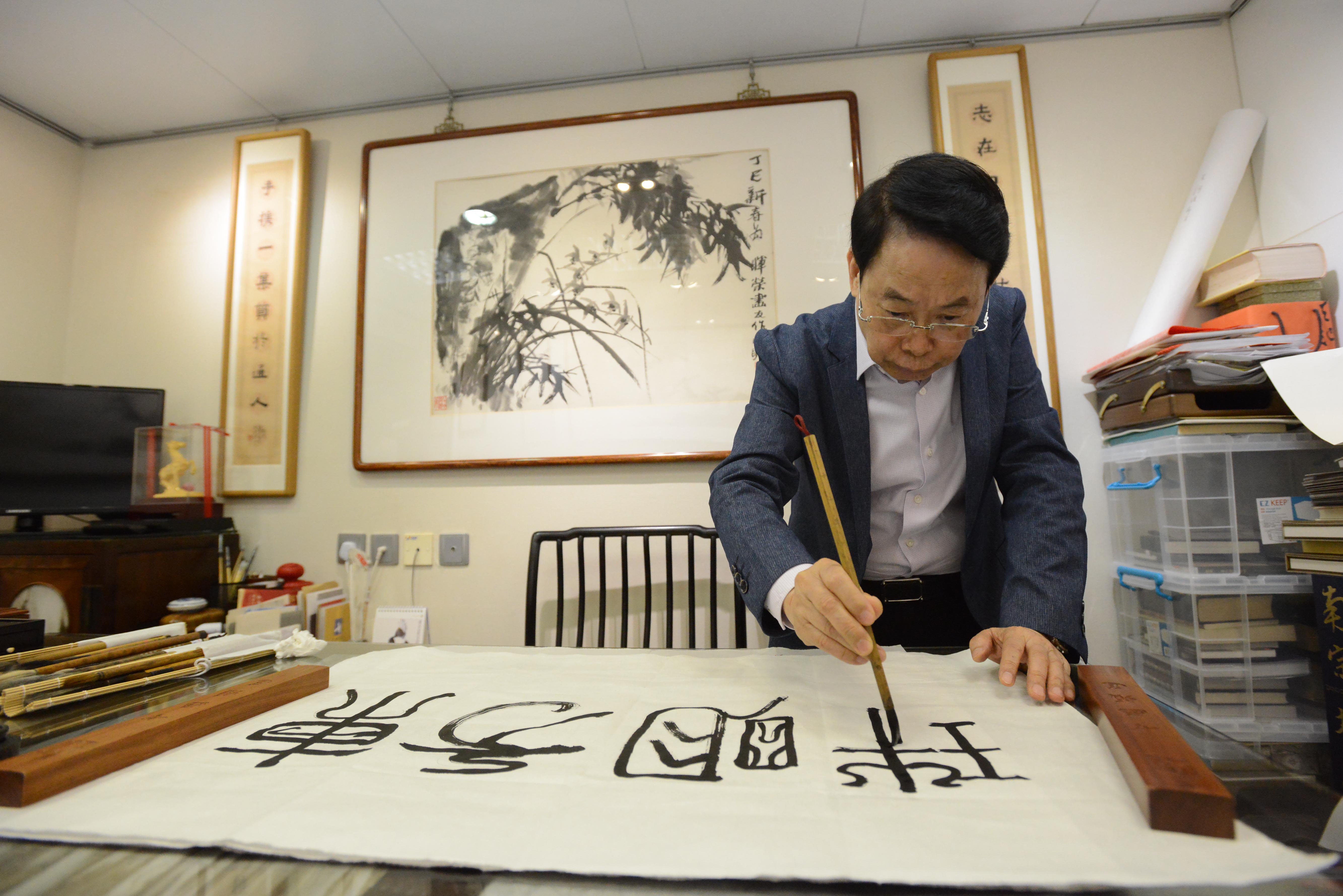 蕭暉榮即席揮毫,示範其擅長的鳥蟲篆。