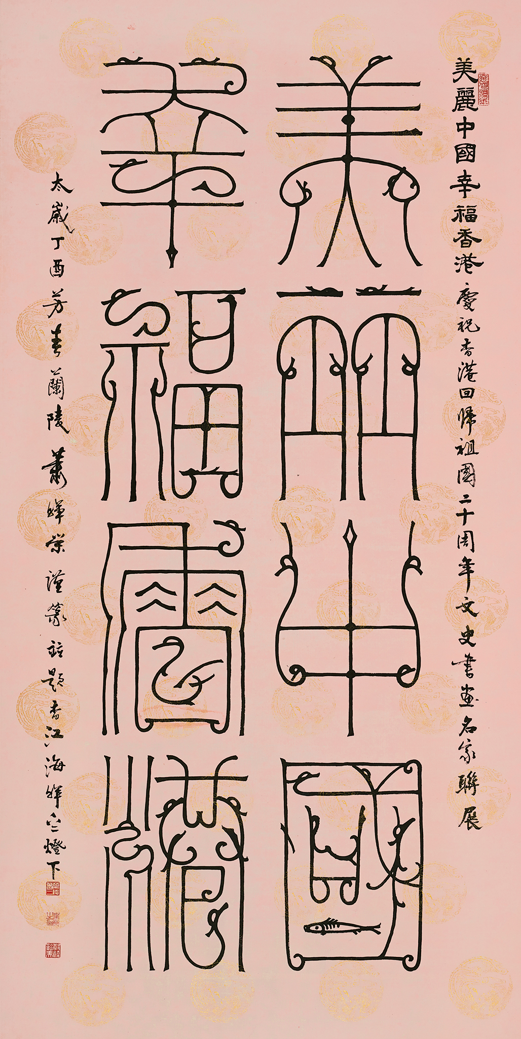 蕭暉榮作品,《美麗中國 幸福香港》,鳥蟲篆。