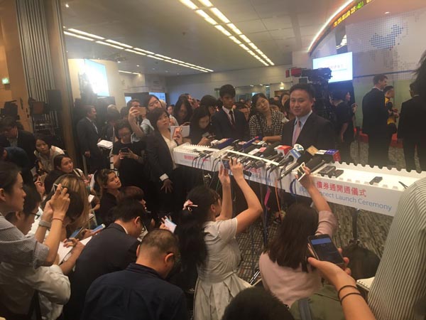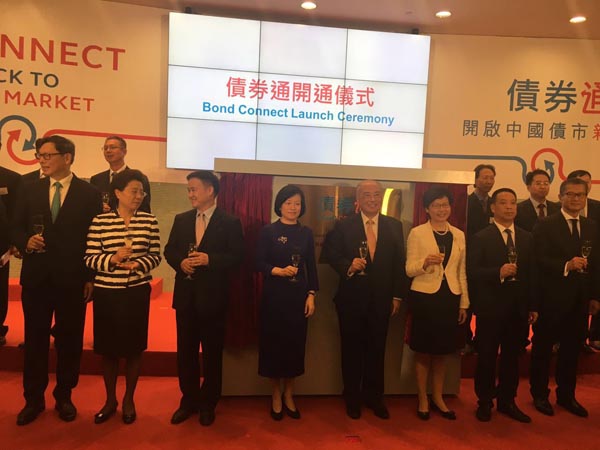 林鄭月娥,潘功勝,港交所主席周松崗和金管局總裁陳德霖分別上台致辭,一時間,台上國語,廣東話,英文滿台飛。之後,由潘功勝和陳德霖敲響銅纙,像征債券通正式開通。