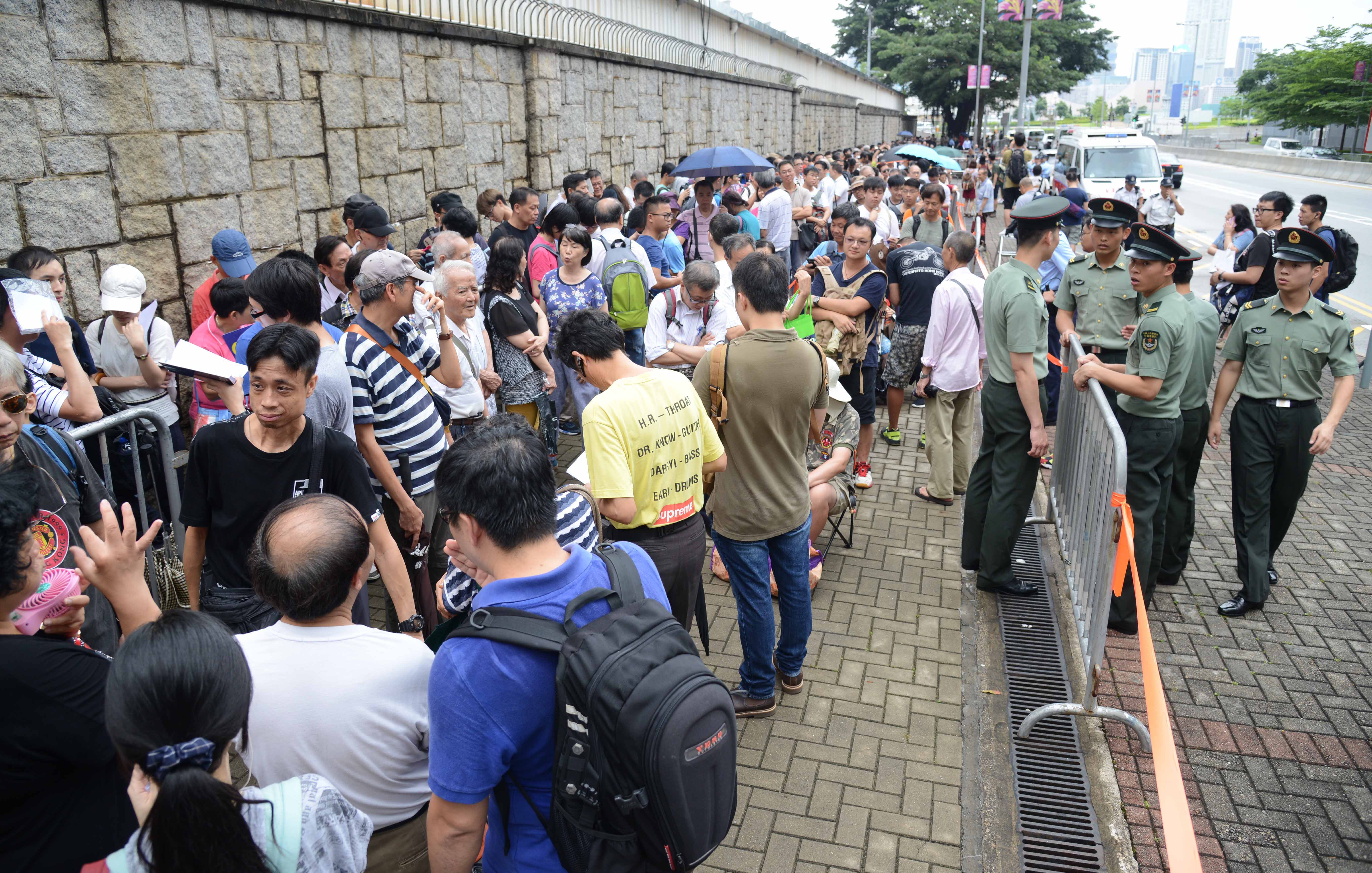 在石崗軍營門外,等候人數遠超門票名額,即使下着大雨仍無阻市民耐心等候的心情,亦有人攜帶帳篷、膠椅、雨具到場做好準備,在場警員則維持秩序及指揮交通,情况大致良好。解放軍駐港部隊人員透露,昨早7時陸續派出籌號,惟全部籌號至11點半經已額滿,解放軍下午1點正開始派發兩天共600張參觀門票。