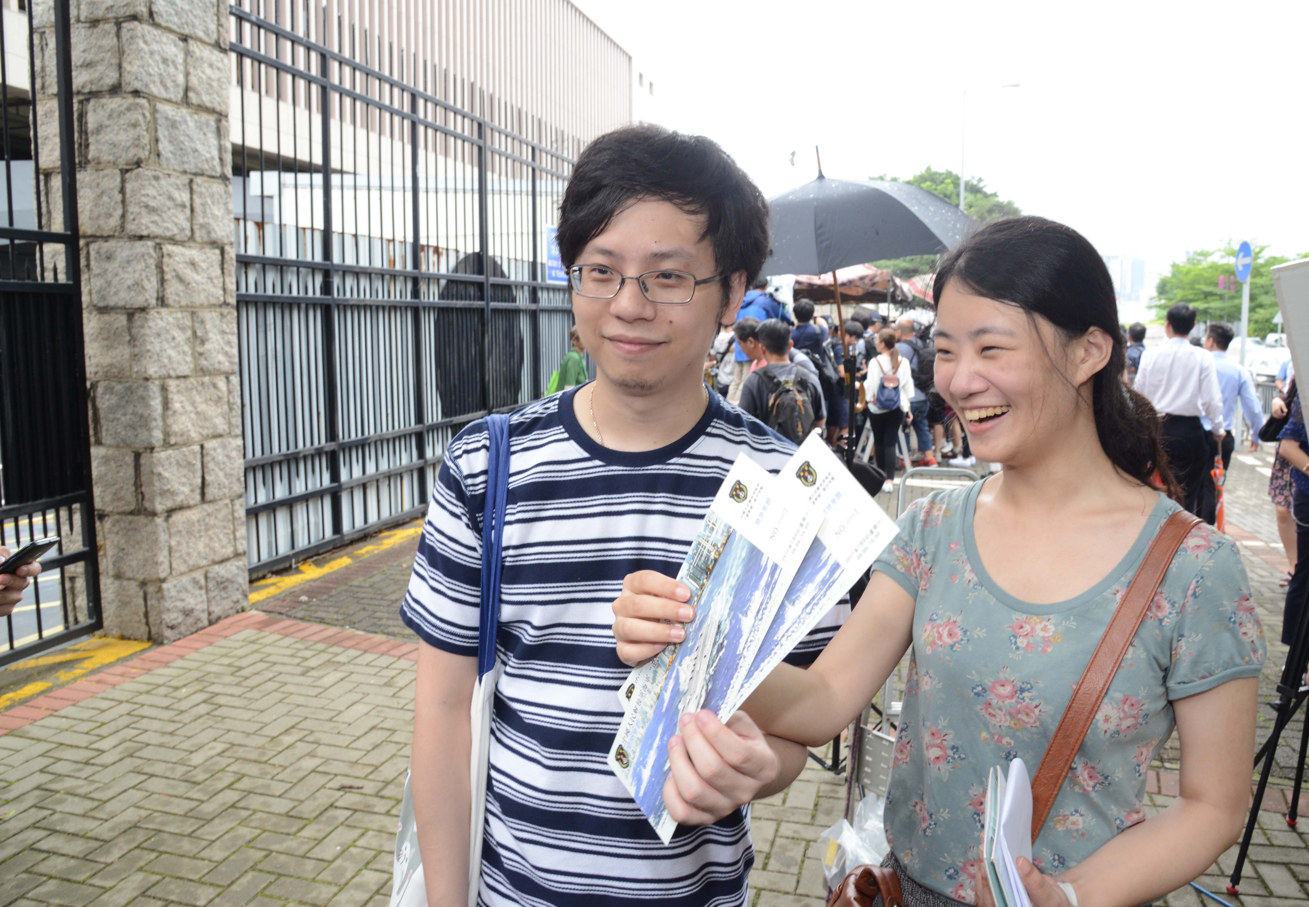 馮小姐與男友排通宵取得門票後感到高興。 記者 崔俊良攝