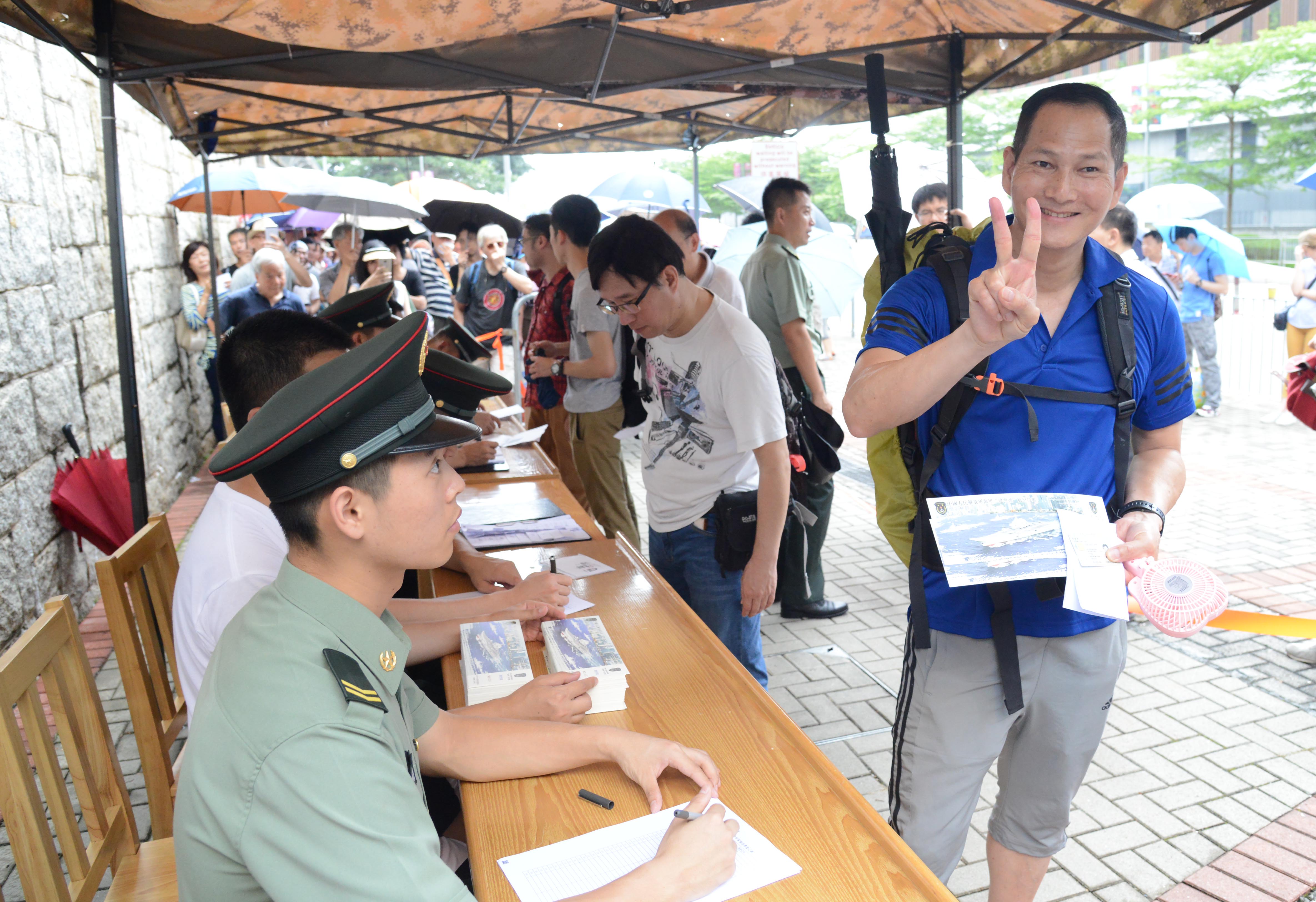 排頭位的林先生前晚10點已經到場等候,他表示對航空母艦方面有濃厚的興趣,故特意向公司請假。第2位取得門票的鄧先生,同樣前晚10點抵達軍營,他指因位置方便泊車而選擇到石崗排隊。排第6位的劉先生笑說:「今次濓機會好難得,當碰下運氣」;星期六將與太太結伴登艦參觀。他前晚從屯門龍門居寓所坐的士出發,11點左右到達石崗。
