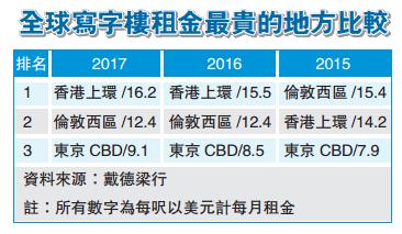 【香港商報訊】記者鍾穎琳報道:戴德梁行昨日回顧本年第二季香港寫字樓及商舖租賃市場表現。戴德梁行執行董事、香港寫字樓部主管Keith Hemshall表示,本季中區甲級寫字樓每月尺租達126元,已超越2008年125.6元的歷史高位,穩占全球之冠,預計中區寫字樓租金全年升4%至7%,每月尺租有機會突破130元。
