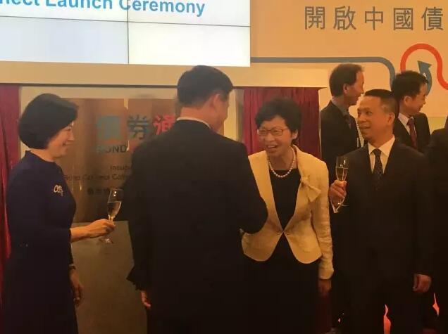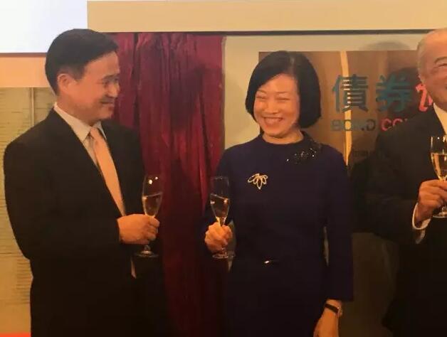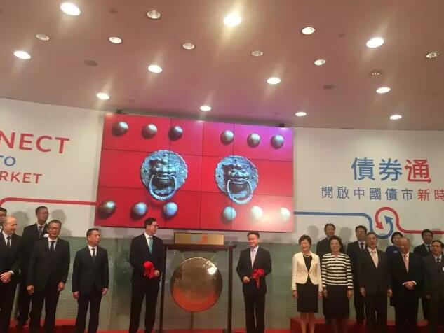 林鄭月娥,潘功勝,港交所主席周松崗和金管局總裁陳德霖分別上臺致辭,一時間,臺上國語,廣東話,英文滿臺飛。之后,由潘功勝和陳德霖敲響銅鑼,象征債券通正式開通。