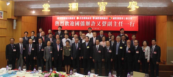 【香港商報網訊】記者曾美玲報道:適逢香港回歸祖國20周年之際,由國僑辦黨組書記、副主任許又聲率領的代表團一行7人,昨日到訪香港潮屬社團總會、香港潮州商會、國際潮團總會及國際潮籍博士聯合會,潮屬四會於潮州會館大禮堂聯合接待了來自國務院僑務辦公室的領導,賓主雙方就當前國際和香港的發展形勢,以及面對世界創新科技的新局面進行了討論。許又聲對潮籍同胞寄予厚望,期望大家繼續發揚拼搏精神,再加上科技助力,可以在粵港澳大灣區建設中找到新的發展機遇,再創佳績。