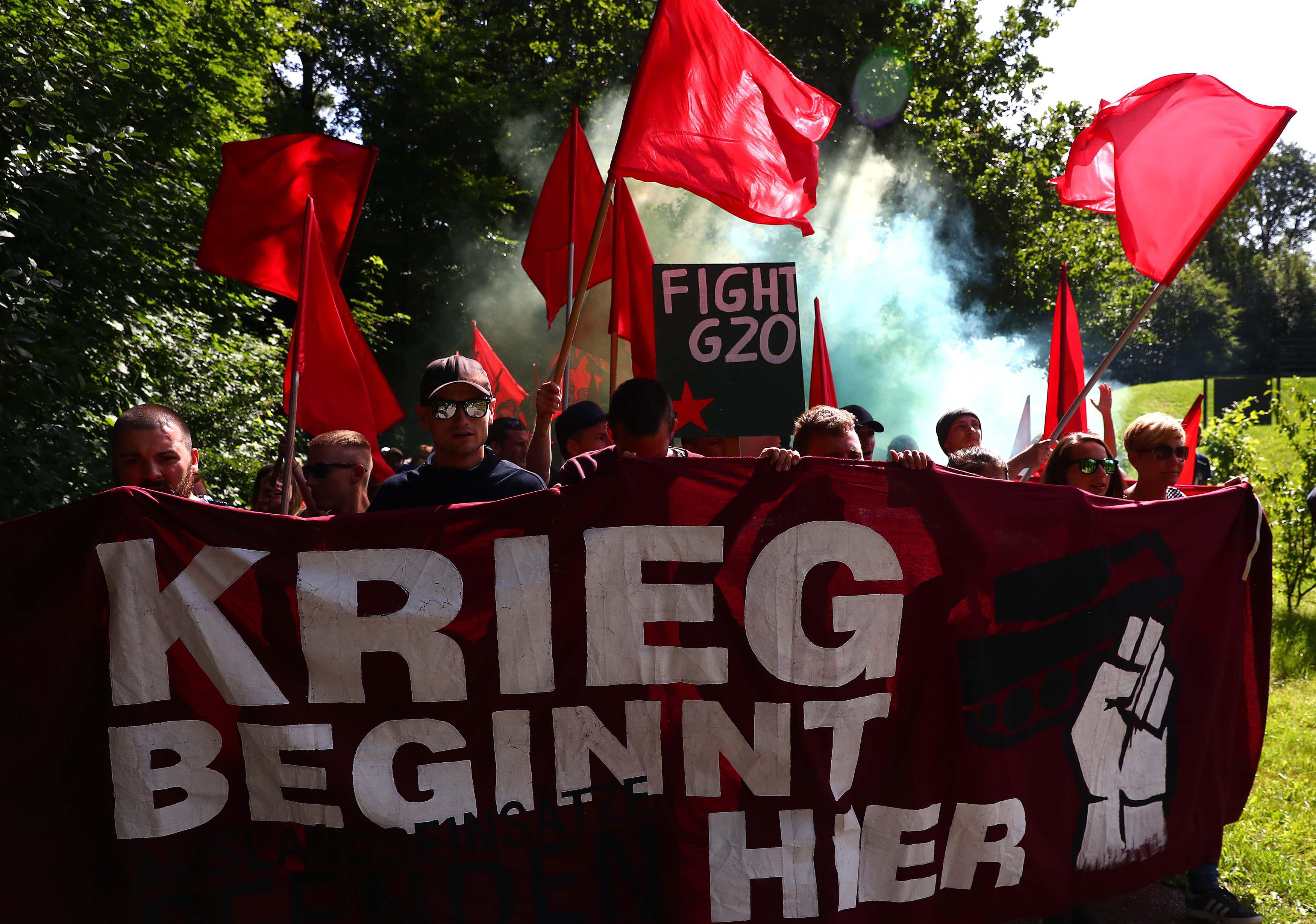 反G20人士在漢堡市中心示威,標語寫著「戰爭就在這兒開始!」。