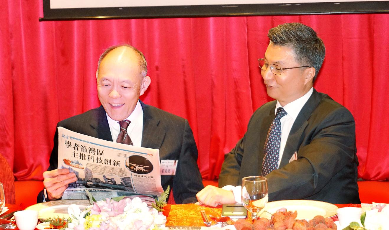 香港廣州社團總會會長霍震寰、廣州市委統戰部副部長曾衛東在談笑風生地看香港商報慶回歸報道