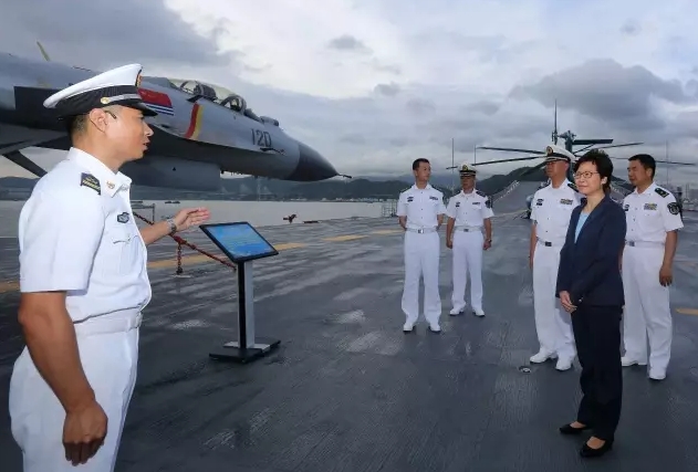 香港特别行政区行政长官林郑月娥在辽宁舰飞行甲板检阅该舰仪仗队