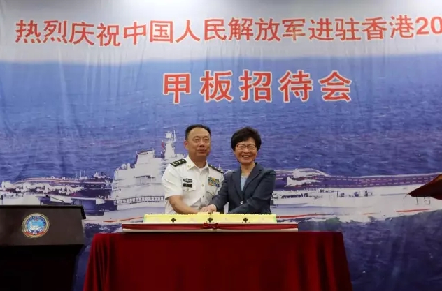 编队指挥员、海军副司令员丁毅中将与香港特别行政区长官林郑月娥共同切蛋糕