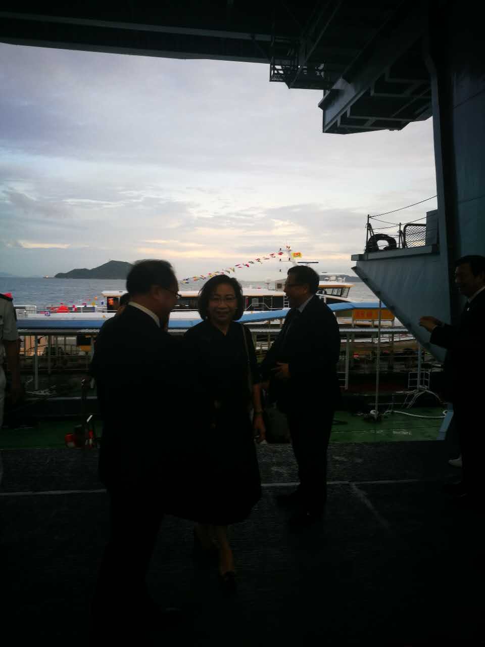 【香港商报网讯】史上首度航母甲板招待会,此刻正在抵港的辽宁号上盛大隆重举行。招待会已于今(7日)晚7时开启,据悉,全国政协副主席董建华、何厚铧、梁振英、特首林郑月娥、中联办主任张晓明、中联办副主任杨建,以及外交部驻港特派员公署特派员谢锋均出席了招待会,并担任主礼嘉宾。海军政委苗华上将也赴会,驻香港部队司令员谭本宏、政治委员岳世鑫应邀出席,显示军方对此次活动的高度重视。海军副司令员、编队指挥员丁毅致辞。