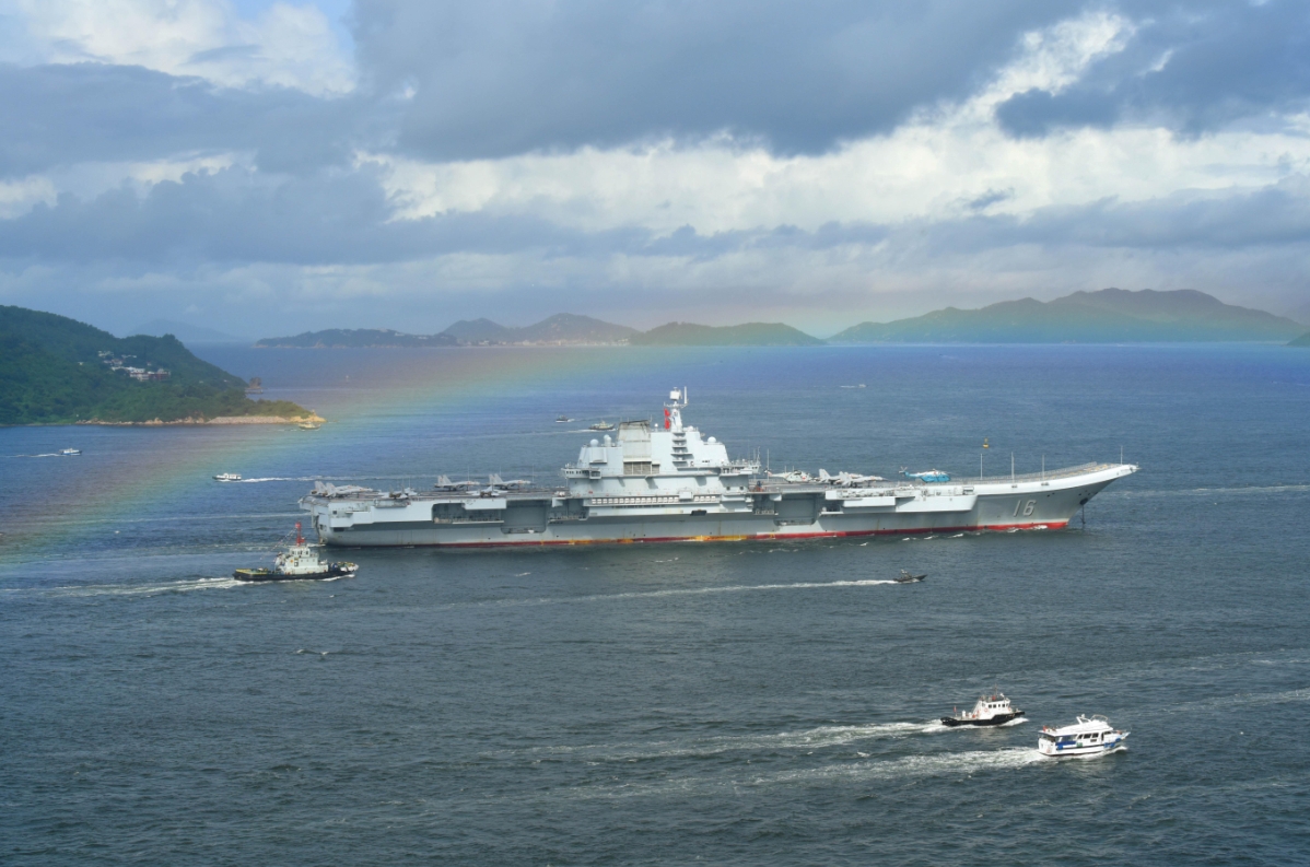7時20分,遼寧艦編隊進入香港特別行政區區界。700餘名官兵在「遼寧號」航空母艦飛行甲板上列隊排成「香港你好」字樣,以海軍獨有的方式向香港市民表示親切、誠摯的問候。航母編隊行進途中,懸挂天際的彩虹恰到好處地浮現,彷彿一道迎賓的拱門,令市民驚嘆「不可思議」。